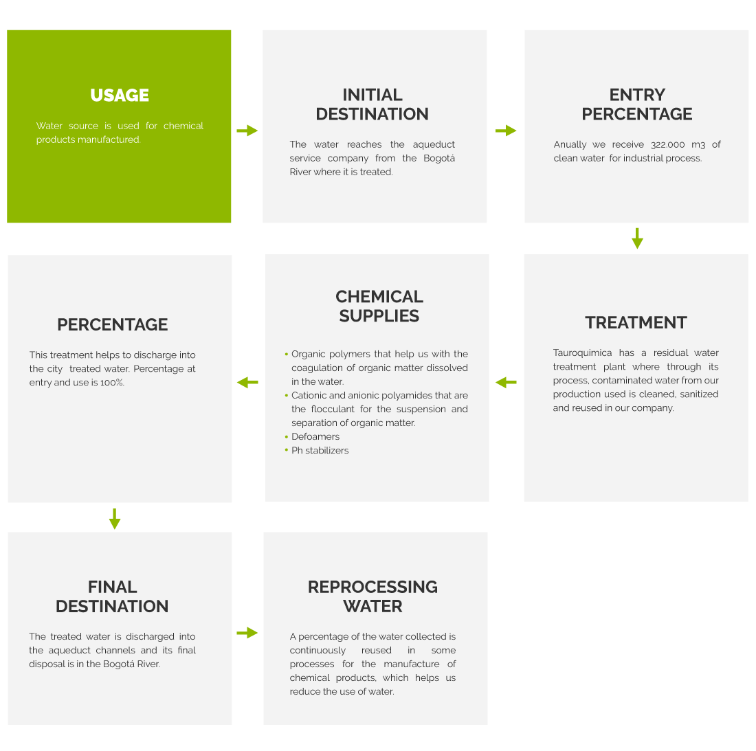 • TAUROQUÍMICA currently aims for the 100% treatment of water consumption in all its processes.
